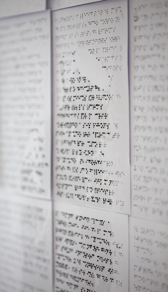 Pd. Esta obra sobre la muerte es, por un lado totalmente distinto, personal para mí. Tanto ésta como una obra anterior fueron realizadas durante el periodo en que cuidé de mi madre, enferma de gravedad por un proceso oncológico. El repetitivo acto de presionar el punzón sobre la tablilla para cada uno de los 47 folios era, para mí, como el acto de tejer. Un acto monótono y casi inconsciente- y con ciertos errores tipográficos debido a mi impericia- pero en el que lo más importante era el tiempo, el permanecer. El repetir y el estar. De ahí, quizás, la ternura con la que quisiera evocar el acto de acercarse al braille. Porque toda comunicación es una cercanía a la vez que una despedida.